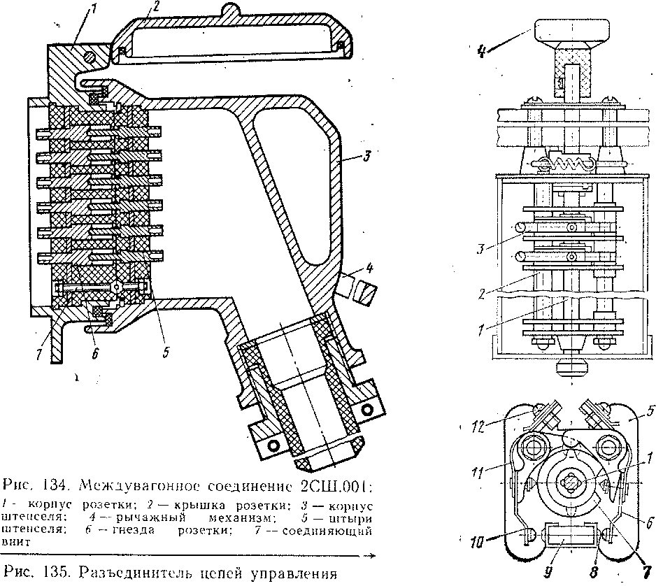 Междувагонные соединения. Коммутирующие устройства устанавливают в силовых цепях и цепях управления. К коммутирующим устройствам можно отнести междувагонные соединения, разъединители цепей управления, различного рода выключатели, рейки зажимов, заземляющие устройства, рубильники.