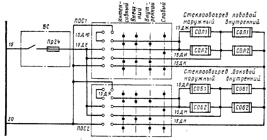 нагревательных элементов панелей обеспечиваются четыре режима нагрева. Переключатели режимов стеклообогрева расположены на одном блоке с выключателем стеклообогрева окон и имеют четыре положения рукоятки (рис. 194, б). В положении рукоятки переключателя Слабый оба нагревательных элемента (на внутренней и внешней пластинах) включены последовательно. Этот режим используют при сравнительно невысоких отрицательных температурах, для предотвращения запотевания, В положении рукоятки Внешний включен нагревательный эле-