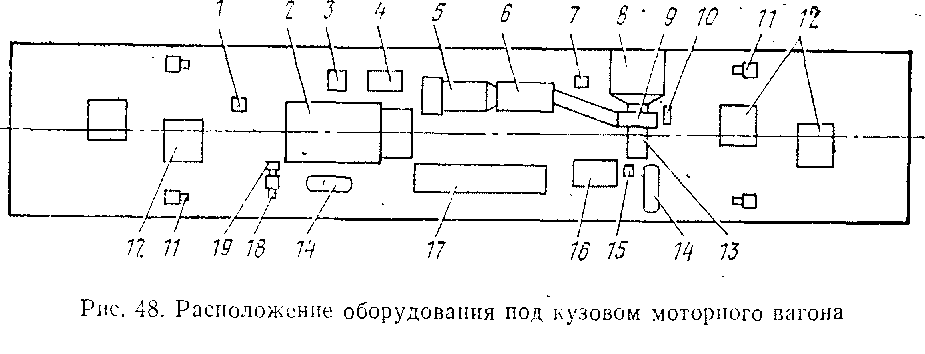 Все основное электрическое и пневматическое оборудование размещено под кузовом вагона (рис. 48): главный трансформатор 2, выпрямительная установка 6, сглаживающий реактор 5, камера с пуско-тормозной аппаратурой 17, тяговые двигатели 12; для охлаждения выпрямительной установки, реактора и масла трансформатора предусмотрен вентиляционный агрегат, который состоит из камеры фильтров 8, вентилятора 9 и фазорасщепителя 13, используемого в качестве при-