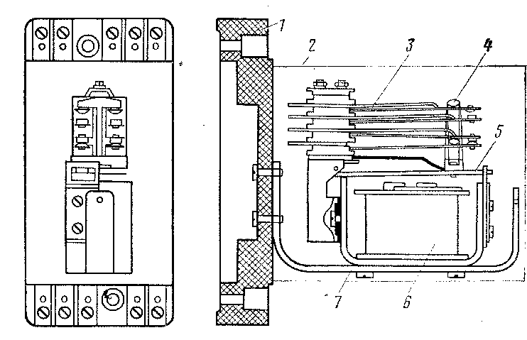 / — основание; 2— кожух; 3— блок-контакты; 4 — стойка; 5 — якорь; 6 — катушка; 7 — магнитопровод