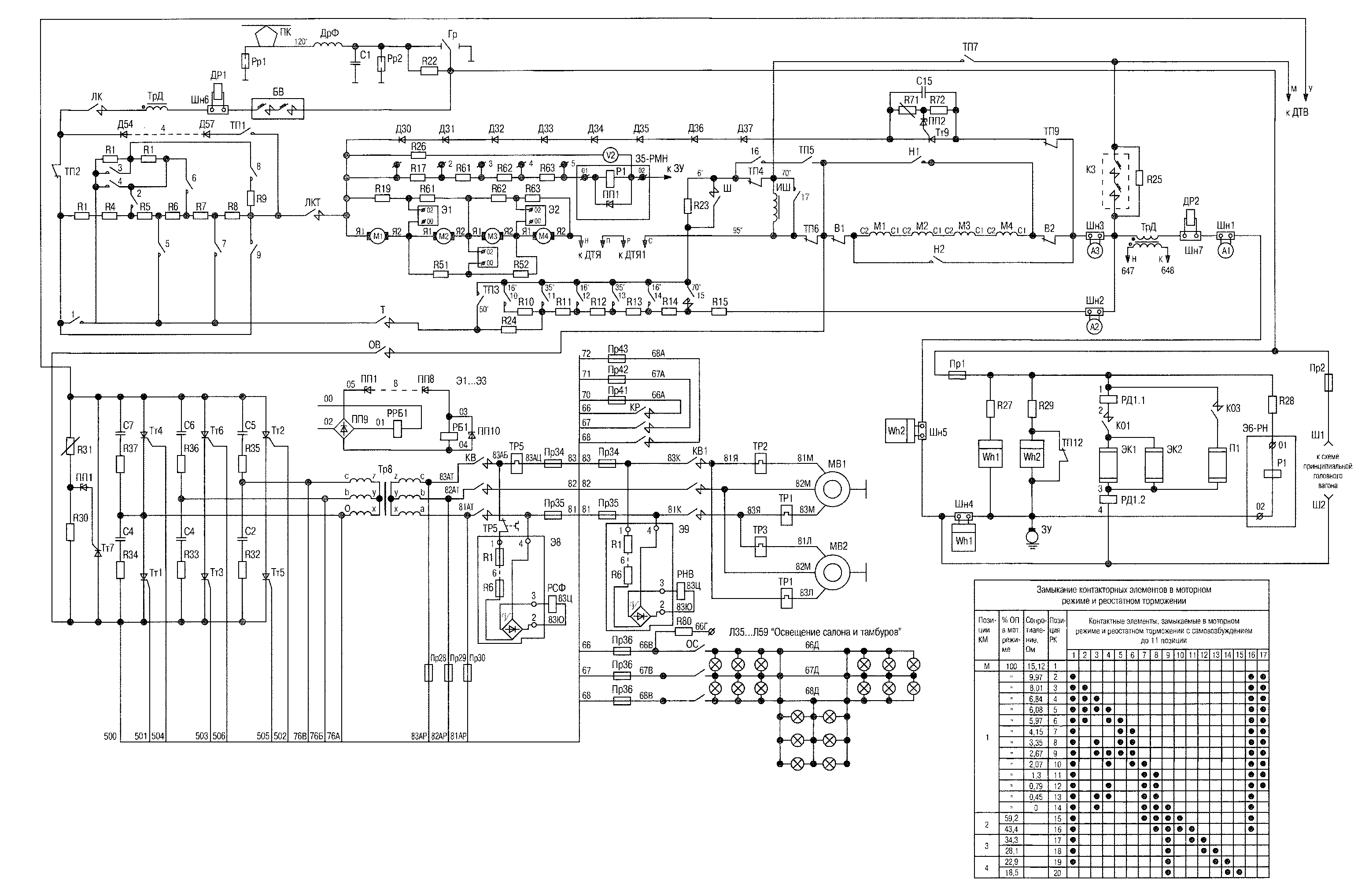 Силовая схема моторного вагона, опечатки в маркировки пусковых сопротивлений, вместо R19, должно быть R18, вместо R61 должно быть R19, вместо R62 должно бызъ R20, вместо R63 должно быть R21.