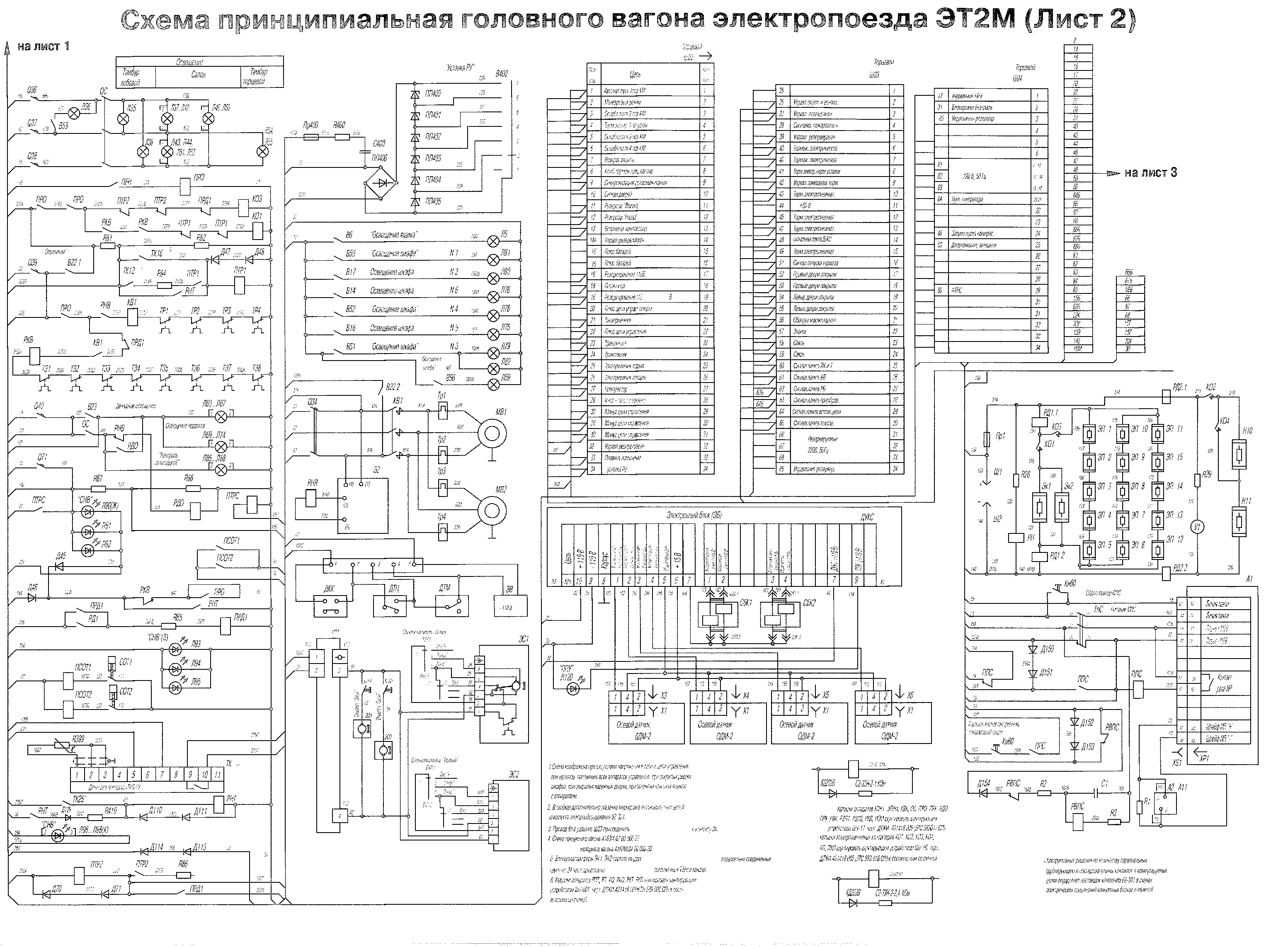 Схема принципиальная головного вагона (лист 2), убрать слова «Стеклообогрев внутренний и наружный». Диод Д46 в проводе 64, развернуть в обратную сторону. Схемы ЭТ2М: