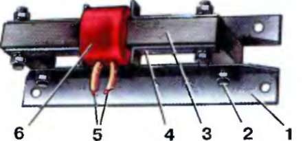 1 - угольник; 2 - стяжная шпилька; 3 - магнитопрч-вод; 4 - скоба; 5 - выводы катушек; 6 - катушки