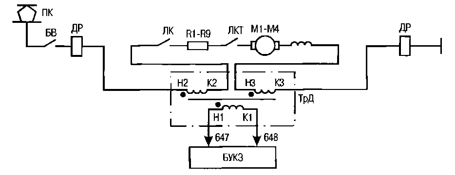питаются током от синхронного генератора через контактор возбуждения КВ по проводам 81, 82, 83 (рис. 3.8). К вторичным обмоткам через тиристор-ный преобразователь (управляемый выпрямительный мост) Тт1-Тт6 подсоединяются обмотки возбуждения тяговых двигателей в режиме электрического торможения с независимым возбуждением. Поскольку эти обмотки входят в высоковольтную схему, а цепи генератора управления относятся к низковольтным цепям, трансформатор ТрВ обеспечивает гальваническую развязку цепей. Он понижает напряжение, которое подается на тиристорный мост Тт1-Тт6. Тиристорами управляет блок САУТ по команде контроллера машиниста.