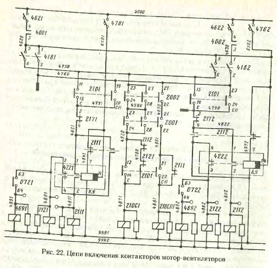При постановке выключателя 4181 в положение "МС" образуется цепь питания катушки вентилятора С переключателя двигателей вентиляторов 2101 (рис. 22): провод 5000, АЗВ 4621, контакты 4— 3 контактора 4001, провод 4620, контакты 5 — 6 выключателя 4181, провод 4750, контакты 23 — 24 аварийных отключателей 2002 и 2001, замкнутые при положении "НЭ", или контакты 27 — 28, замкнутые при положениях "АВ 1" или "АВ 2" отключателей 2001, 2002, провод 4920, обратные блок-контакты контактора 2112, провод 4780, обратные блок-контакты контактора 2121, провод 4871, катушка вентиля С переключателя двигателей вентиляторов 2101, провод 9991. После перевода переключателя 2101 в положение "С" замыкаются его блок-контакты 13 — 14 между проводами 4920 и 4871, и катушка вентиля С переключателя 2101 становится на самопитание.