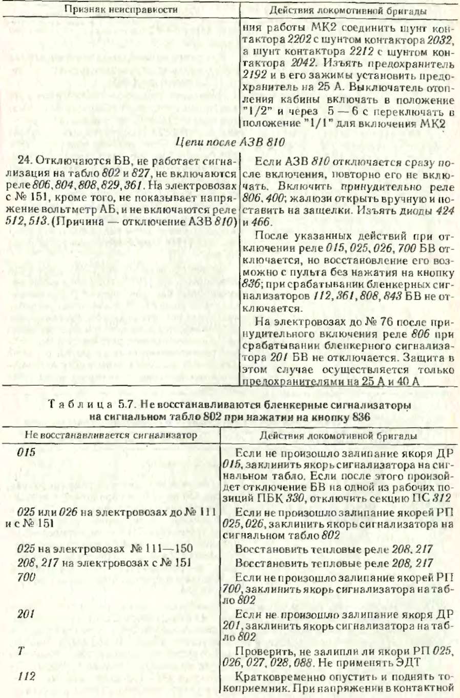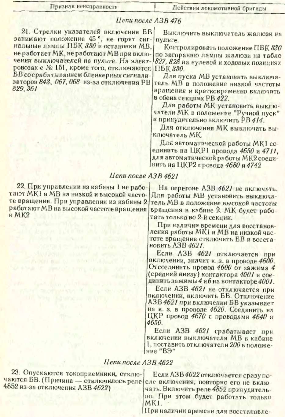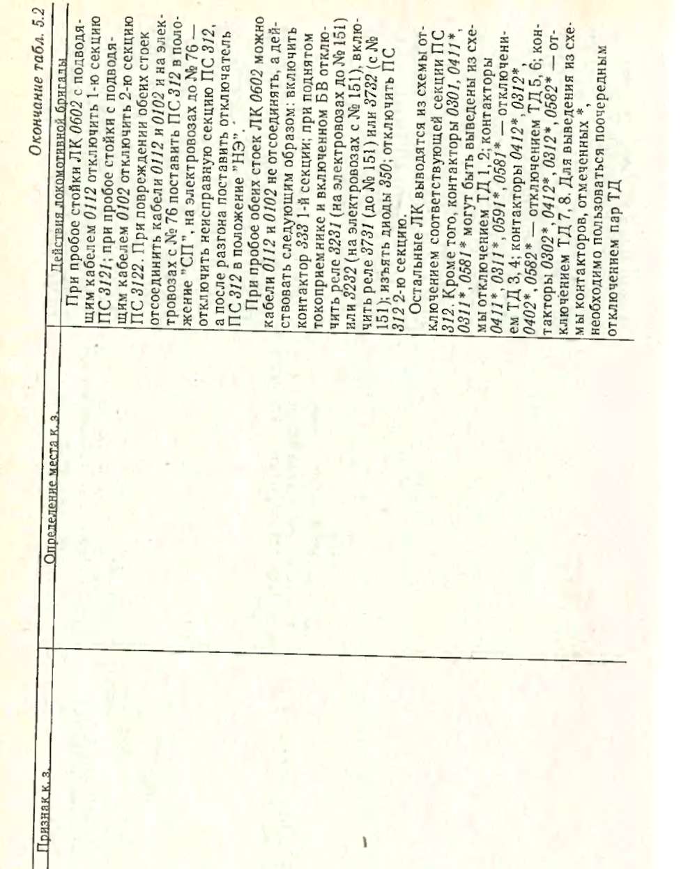 На электровозах с № 76 поставить ПС 312 в положение "СП"; на электровозах до № 76 перед троганием с места отключить ПС 312 одну из секций, а после разгона до 30—40 км/ч опять включить ее Действовать в соответствии с рекомендациями, приведенными в табл. 5.5 Перейти на СП соединение для выявления секции с неисправным ЛК- Отключить данную секцию ПС 312 или соответствующую пару ТД. Проверить работу схемы от ПБК 330 задней секции. При наличии времени действовать согласно п. 79 табл. 5.5 Отключить неисправную секцию ПС «3/2. На остановке выявить визуально не-включающийся контактор и отключить соответствующую пару ТД. Проверить работу схемы от ПБК 330 задней секции. При наличии времени действовать согласно п. 79 табл. 5.5 Отключить 2-ю секцию ПС 3122 или ТД 7, 8. Следовать на 1-й секции или на шести ТД. Проверить работу схемы по ПБК 330 задней секции. При наличии времени действовать согласно п. 79 табл. 5.5 Отключить неисправную секцию ПС 312. На остановке при невключающемся ЛК 0591 отключить ТД 3, 4; при невключающемся ЛК 0592—ТЦ. 5, 6. Проверить работу схемы от ПБК 330 задней секции. При наличии времени действовать согласно п. 79 табл. 5.5 |