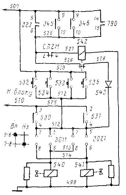 при срабатывании вспомогательного реле 790 (замыкаются контакты 14-15) автоматической локомотивной сигнализации (АЛСН), приведении в действие аварийного выключателя «Стоп» 345 (346) (контакты 9-10) и при экстренном торможении (контакты 5-6 реле 323). В аварийных ситуациях напряжение от провода 500 через одни из указанных параллельно соединенных контактов подводится к катушке вспомогательного реле 542 через контакты 2-4 'скоростемера типа СЛ2М, которые размыкаются при скорости движения электровоза менее 10 км/ч. Этим предотвращается неоправданная подача песка после остановки локомотива.