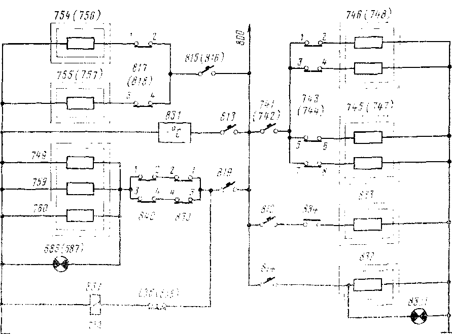 Цепи питания нагревательных элементов 754, 755 (756, 757) для обогрева ног в кабине машиниста включаются переключателями 817(818) ц защищены АЗВ 815(816) (рис. 29). Обогреватели спускных кранов главных резервуаров 759, 760 и влагосборнн-ков 749 получают питание через АЗВ 819 и переключатели 839, 840. При этом загорается сигнальная лампа 586(587). Электро-пневматическин вентиль 837, катушка которого получает питание