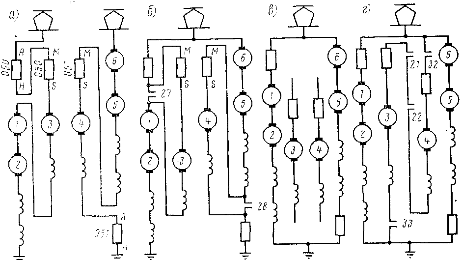 Переход на параллельное соединение, который осуществляется шунтированием части двигателей, начинается введением в каждую цепь последовательно-параллельно соединенных тяговых двигателей секций АН и MS пусковых резисторов 050, 051 — 1-я переходная позиция (рис. 6, а). При перемещении вала группового переключателя 045 в промежуточное положение 4 замыкаются его контакторы 27, 28 и двигатели 3, 4 шунтируются секциями MS резисторов 050, 051 — 2-я переходная позиция (рис. 6, б). На 3-й переходной позиции размыкаются вначале контакторы 23, 24 (с дугогашением), а затем без разрыва тока — контакторы 39, 40 (без дугогашения), вследствие чего двигатели 3, 4 отключаются (рис. б, в). Далее замыкаясь, контакторы 32, 33 (в промежуточном положении 6 вала группового переключателя) цепь двигателя 4 присоединяют к сети, а цепь двигателя 3 — к земле. Переход заканчивается на 34-й позиции замыканием контакторов 21, 22, в результате чего через двигатели 3, 4 начинает проходить ток (рис. 6, г).