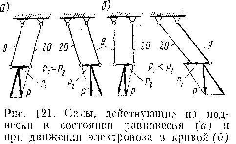 Во время движения электровоза по прямому участку пути подвески 9 и 20 обеих сторон кузова (рис. 121, а) располагаются симметрично относительно вертикали. Система находится в равновесии и продольные оси кузова и тележек электровоза совпадают.