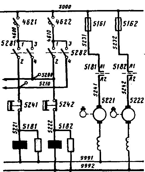 - провод 5000, АЗВ 4621, провод 4600, контакты 1 - 2 выключателя 5281, замкнутые в положениях 2 и 4, провод 5210, контакты реле давления 5241, провод 5221, катушка контактора 5181, провод 9991.