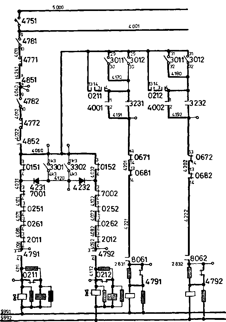 - провод 4060, обратные блок-контакты 3-4 ДР 0151, провод 4031, РП 700 отопления поезда, провод 4101, РП 0251 (1-2 ТЭЦ), провод 4071, РП 026 (3-4 ТЭЦ), провод 4081, ДР 2011 вспомогательных машин, провод 4091, прямые контакты контактора управления 4791, провод 411, штепсельные разъёмы жоксовых соединений 2ХС1 БВ 0211, электромагнитная удерживающая катушка БВ 0211, клемма «1»БВ 0211, провод 9991.