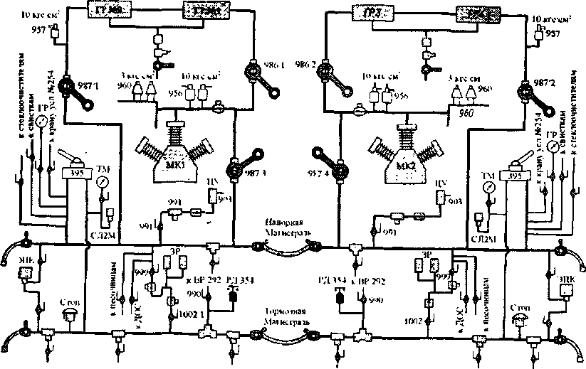 При работе мотор-компрессора 900 воздух через фильтры всасывается в цилиндры низкого давления, сжимается в них до давления 2,5 3,0 кгс/см2, затем при обратном ходе поршней выталкивается в холодильник 901, из которого поступает в цилиндр высокого давления. Здесь он сжимается до давления 9,0 кгс/см' и нагнетается через обратный клапан 951 и разобщительный кран 956 в два главных резервуара на каждой секции, соединенных попарно. На трубопроводе воздуха после 1-й ступени сжатия установлены предохранительный клапан 960, отрегулированный на давление 3,0 кгс/см2, а также кран для спуска конденсата 1003/18 (1003/19). Такой же кран 1003/23 (1003/24) предназначен для спуска конденсата из влагосборника 946 компрессора. Разобщительный кран 1018 служит для отключения холодильника в зимнее время. На трубопроводе после 2-й ступени сжатия установлены два предохранительных клапана 95611, 2 (95613, 4), отрегулированных на