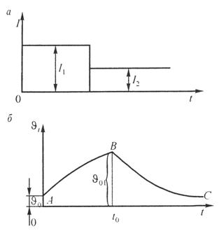 времени (а) и кривая нагревания провода при изменяющемся токе (б)