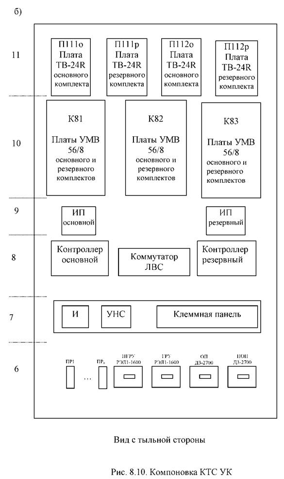 В нижней части с тыльной стороны шкафа расположены полка с предохранителями, конструктивно допускающая установку реле типа РЭЛ (2 реле переключения комплектов и 2 реле реализации ответственных приказов, при необходимости большего количества реле ОП, последние размещаются на стативах ЭЦ). На седьмой полке размещаются модули обработки аналоговых сигналов (измерительный модуль и устройство нормализации входных сигналов), а также клеммная панель, где подключаются напряжения цепей питания, управления и контроля. Для удобства тестирования, подключения периферийного оборудования (дисплея, клавиатуры, манипулятора «мышь» и т.п.) на восьмой полке размещаются контроллеры основного и резервного комплектов и коммутатор (Switch) или концентратор (HUB) локальной сети. Питание этих устройств осуществляется от импульсных источников, расположенных на следующей (9) полке, причем они должны располагаться по возможности ближе к контроллерам с целью уменьшения падения напряжения в соединительных проводах, что критично для устойчивой работы процессора. На следующих полках (10) располагаются платы контроля объектов, например для диагностики или платы управления ТВ-24Я или кросс-платы сопряжения с объектами, на которые устанавливаются микроэлектронные платы типа ЦОО-48Р (слева основного комплекта, справа резервного). Проектирование компоновки КТС УК при большем числе плат выполняется путем увеличения числа полок соответствующих УСО, располагающихся выше или ниже относительно средней полки