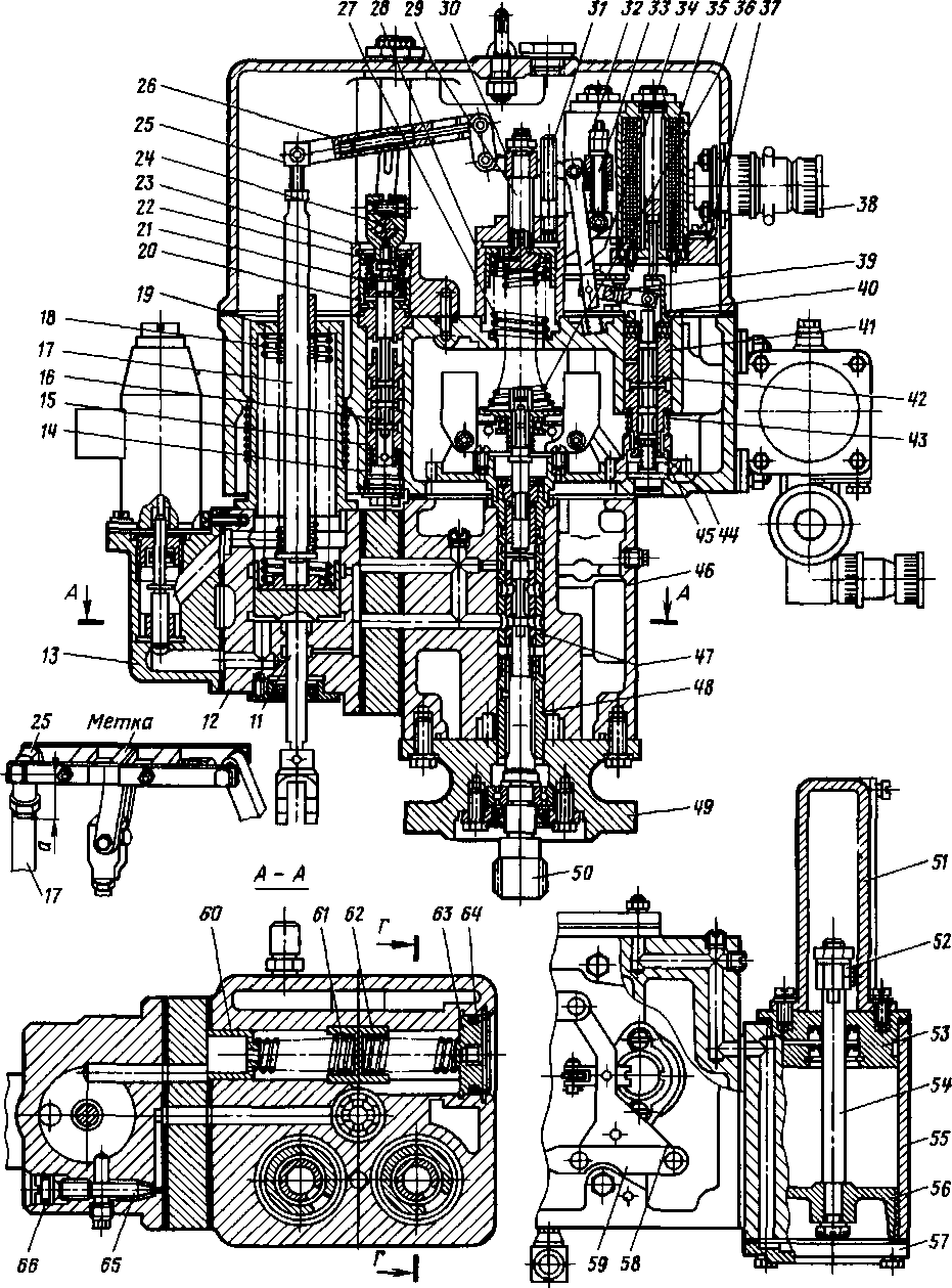 Серводвигатель регулятора (см. рис. 31) прикреплен к боковой поверхности корпуса 46. Шток уплотнен в крышке сальником и имеет серьгу для соединения с рычажной системой привода реек топливных насосов. На верхнем штоке имеется винт 25 для регулировки уровня мощности, поддерживаемого регулятором. В корпусе серводвигателя установлена игла 65 для регулирования устойчивости системы. Игла уплотнена в корпусе резиновым кольцом 66. Верхний корпус прикреплен к корпусу регулятора четырьмя болтами. В верхнем корпусе 2 расположены узлы регулирования мощности и узлы электрогидравлической системы управления частотой вращения. На задней стенке верхнего корпуса 2 установлена плита 70.