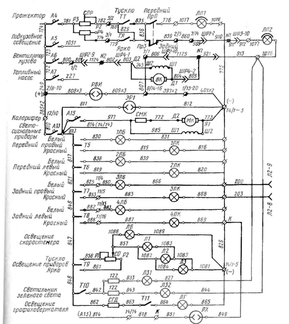 Рис. 44. Электрическая схема ценен светосигнальных приборов, мсктродвигателен вентилятора кузова и калорифера кабины