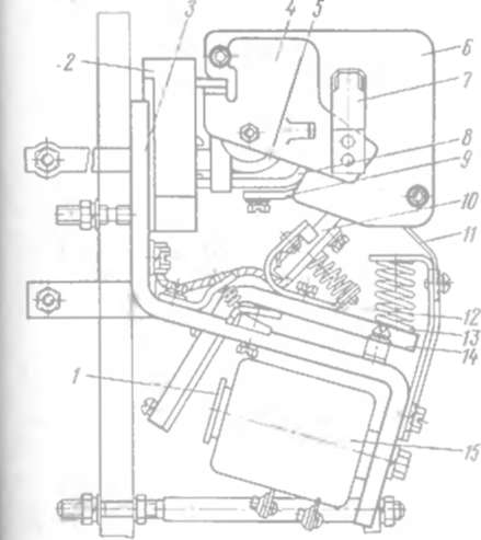 Контактор пуска дизеля КПВ-604. Для замыкания цени пуска дизеля применяются однополюсные электромагнитные контакторы КПВ-604. Контактор (рис. 71) представляет собой моноблочную конструкцию, все узлы и детали которой собираются на основной скобе 3 магнитопровода. На одном конце скобы укреплен сердечник / с втягивающей катушкой 15, на другом — пластмассовое основание 2, несущее на себе дугогасительную катушку 5, неподвижный контакт 9, дугогасительные щеки 4 и камеру 6, надетую на дугогасительный рог 8. Положение дугогасительной камеры фиксируется п юскнми прижимами 7, расположенными на щеках, и ро том //, укрепленным па основной скобе магнитопровода. В прорезь основной скобы вставляется якорь 14, на котором крепится скоба 12,