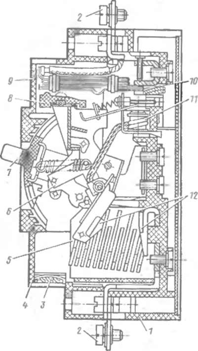 / основ л нир. 2 — зажим дли подсоединения проводов; 3 — устройство; 4 крышка: 5 — дуто гасительная камера, 6 — механизм управления: 7- рукоятка: Я реї" к», 9 нагреватель термоэлемента; '0 — тепловой максимальный р«с ценитель тока; // — электромагнитным расщепитель тока: 12 — коммутирующие контакты