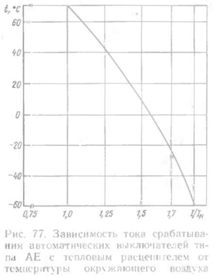 электромагнитными расцепителями, для защиты электродвигателей — автоматы с электромагнитным и тепловым расцепителями с косвенным подогревом. В автоматах на поминальные токи более 60 Л имеются дугогасительпые камеры с сетчатыми переї ородкачи. Время-токовые и температурная характеристика автоматов типа АЕ приведены на рис. 76 и 77.