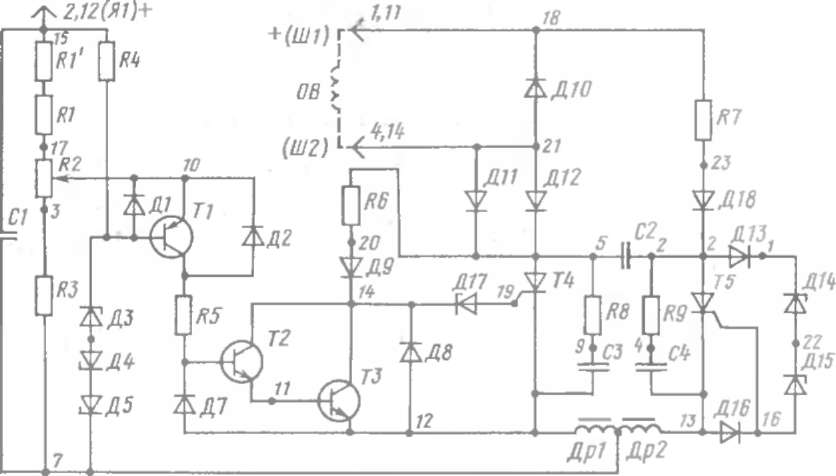 Регулирующий орган состоит из двух тиристоров Т4 и 775, диодов Д8, Діб, Д18, резисторов к]6— І-Ї9, стаби іигронов Д14, ДІБ, Д17, дросселей Дрі и Др2 м конденсаторов С2—С4: Нагрузкой регулирующего органа является обмотка возбуждения ОВ вспомогательного генератора. Параллельно обмотке включен диод Д10 для уменьшения перенапряжений на обмотке возбуждения в момент выключения тиристора Т4. Тиристоры Т4 и То соединены по схеме мультивибратора. На вход мультивибратора подается ток управляющего электрода, обеспечивающий открывание тиристора Т4. Мультивибратор работает следующим образом. После появления напряжения на аноде Т4 он открывается, в результате чего ток от аккумуляторной батареи начинает протекать по двум цепям: ОВ, Т4," Дрі и /?7. Д18, С2, Т4, Дрі. Напряжение на конденсаторе С2 возрастает и становится достаточным для пробоя стабилитронов Д14. Д15. что приводит к открытию тиристора То. Заряженный конденсатор С2 начинает разряжаться через открывшийся тиристор То и еще открытый Т4. Разряда конденсатора закрывает тиристор Т4 за счет подачи напряжения обратной полярности (положительный потенциал правой обкладки конденсатора С2 прикладывается к катоду Т4, левая отрицательно заряженная обкладка соединена с анодом Т4). После запирания Т4 происходит перезаряд конденсатора через обмотку возбуждения ОВ и открытый тиристор Т5. Потенциал анода и ток управления Т4 растут, тиристор Т4 открывается, а 775 закрывается разрядным током конденсатора, и процесс повторяется. В результате возникает устойчи-