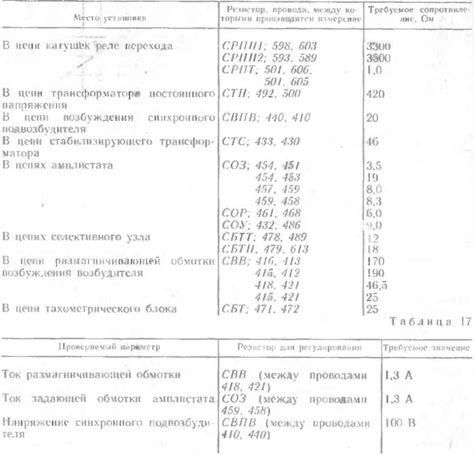 Для исключения воздействия индуктивного датчика на систему возбуждения необходимо при нулевой позиции контроллера разомкнуть цепь регулировочной обмотки амплистата (отключить провод 469). На 15 й позиции контроллера при токе генератора через водяной реостат 1600 1800 А должны быть проверены и при необходимости подрегулированы параметры, указанные в табл. 17.