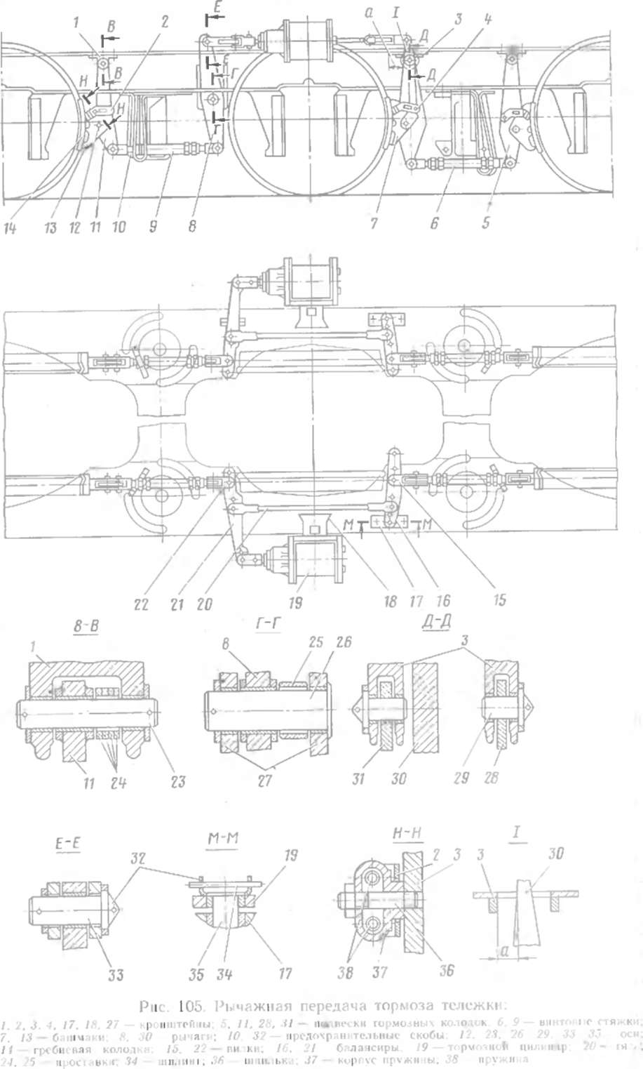 Рычажная передача тормоза тележки (рис. 105) состоит из двух самостоятельных групп подвесок и рычагов, расположенных одна на левой, другая па правой стороне тележки. Каждая группа приводится в действие от своего тормозного цилиндра, укрепленного на раме тележки.
