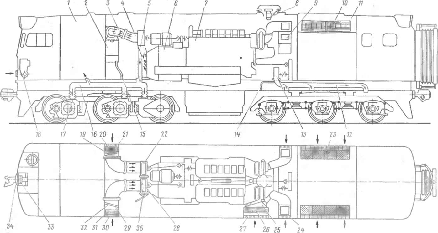 т -ль 1ый ка мі нентнтя ора охлаждения ти мпп генератора: б - тяговый генератор. 7 дизель. 8 — вентилятор купона. 9 — поздухоочистите.и. дизеля; 10, 21, 2-І 27 30. 34 жатюзі // х іоди ьнан камера 12, Ів імшсіотельные к-пмлы вентиляторов охлаждении л юных -і іектролвнгатслен. ІЗ — веитииїтор охлаждения тягопых злектродитпо.чей задней тележки; 14. 35 — трупы отвода пыли и ол.ігн 15 — сливная труба; 17. 19. 32— предохранительные сетки; 18 ото Ш1Тслы10-всн1н.'жцио1Н1ЫЙ агреглт, 20. 23. 26. 91. 33 — фильтры очистки воздуха. 22 — вентилятор охлаждении тяшных электродвигателей передней тележки. 28 вентилятор охлаждении тяголого генератори; 29 — всасывающий канал вентилятора охлаждения тягового генератора