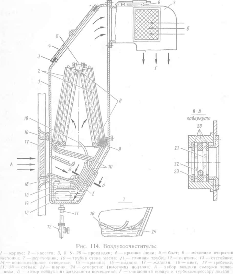 и далее через четыре отверстия 2 поступает в поддон. Грязное масло из отстойника сливается через трубу // при открытом вентиле 12. Уровень масла в воздухоочистителе должен поддерживаться между верхней и нижней отметками, нанесенными на смотровом стекле 21. Уровень масла показывает окрашенный красной эмалью шарик 22, плавающий в пространстве между стеклами 21 и 23. Превышение уровня масла приводит к чрезмерному поступлению его на кассеты и забросу в дизель. При уровне ниже допустимого происходит засорение, кассет пылью, что повышает сопротивление воздухоочистителя.