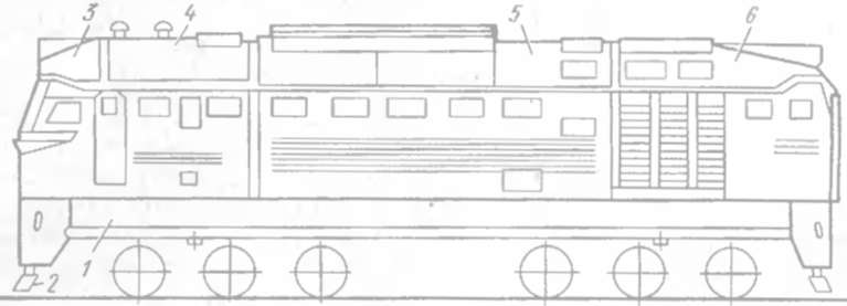 Кузов тепловоза 2М62 ненесущего типа с безраскосной системой каркаса: элементы каркаса образуют прямоугольную решетку. Выбор такой конструкции кузова обусловлен ее технологичностью. Кузов (рис. 120) состоит из следующих элементов: кабины 3, про-ставки 4, кузова над дизелем 5 и блок-тамбура с холодильной камерой 6. Перечисленные элементы свариваются между собой и привариваются к раме тепловоза. Путеочиститель 2 крепится болтами снизу к стяжному ящику рамы тепловоза. В торцах блок-тамбуров обеих секций имеются проходы с переходными площадками.