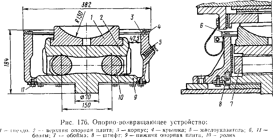 Разборка опорно-возвращающего устройства. Расконтрите и отверните болты 6 (рис. 176). Снимите крышку 4, выньте гнездо 1, верхнюю опорную плиту 2 и обойму 7 с роликами 10. Отверните болты // и отсоедините нижнюю спорную плиту 9 от корпуса 3.