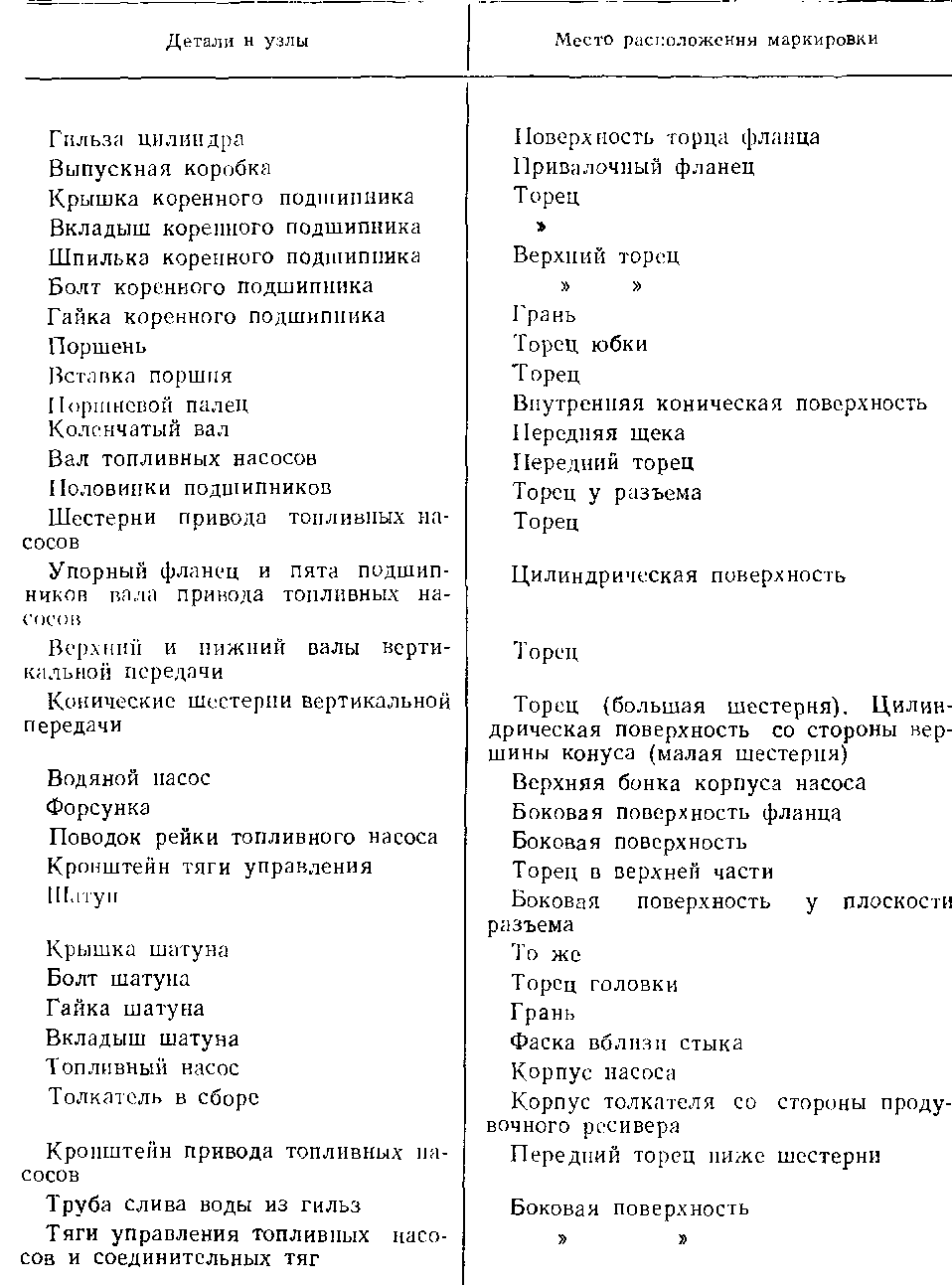 Таким образом, полное маркирование для определения положения детали будет состоять из указанных выше пяти разрядов букв и номеров. Эти буквы и цифры располагаются в той последовательности, в какой они указаны выше. Например, маркировка А1 на цилиндровой гильзе означает, что она принадлежит к дизелю А и к цилиндру № 1 (первому со стороны управления).
