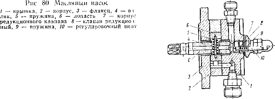 Система смазки компрессора комбинированная: под давлением смазывается шатунная шейка коленчатого вала, пальцы прицепных шатунов и поршневые пальцы; остальные детали смазываются разбрызгиванием. Смазка подается масляным насосом (рис. 80) лопастного типа из картера через сетчатый фильтр, а избыток масла через редукционный клапан 8 сливается в картер компрессора.