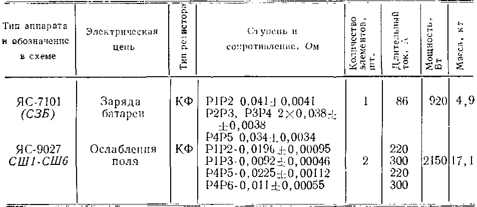 Ящики с резисторами предназначены: типа ЯС-7101 как добавочное сопротивление (СЗБ) в цепи заряда аккумуляторной батареи, типа ЯС-9027 (рис. 128) как сопротивление в цепи ослабления поля (СШ1—СШ6) тяговых электродвигателей на первой и второй ступенях. Резисторы выполнены из фехралевой ленты 2, навитой на фарфоровые изоляторы 7, которые крепятся на П-образном стальном держателе 3. Ребра изоляторов имеют винтовую канавку, в которой расположена лента. Изготовленный таким образом элемент крепится на стальных скобах (стойках) 6 изолированными шпильками 4 и круглыми фарфоровыми изоляторами 5.