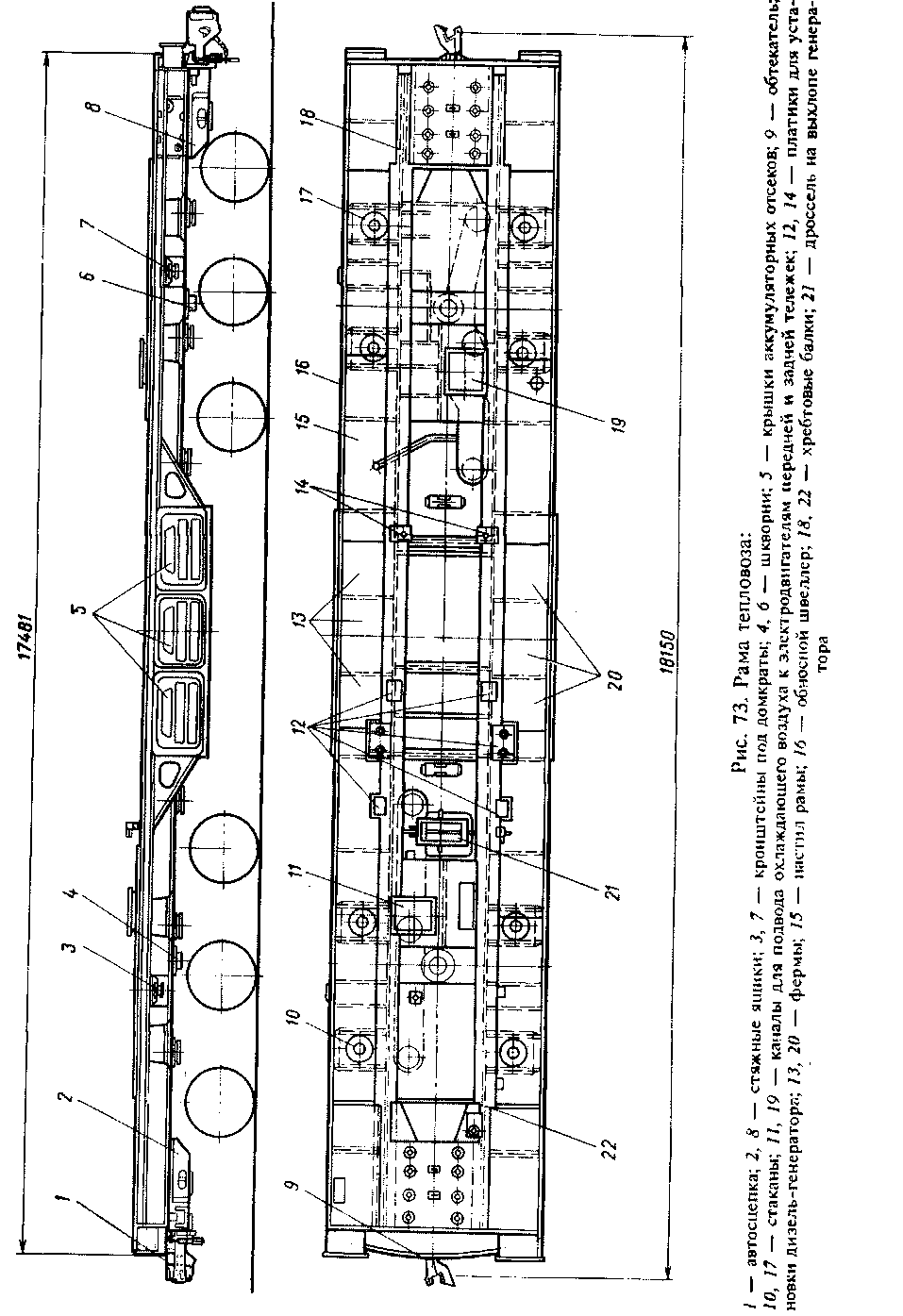 Снизу к специальным усилениям рамы, имеющим коробчатые сечения, приварены два шкворня 4 и 6, на которые установлены и приварены прерывистым швом сменные шкворневые кольца, изготовленные из-стали. Сверху вся рама, кроме центральной ее части, где выполнен поддон для дизеля, закрыта приваренным к ней настилом 75. Снизу настил приварен.к части рамы между хребтовыми балками по всей ее длине от переднего стяжного ящика до заднего. В месте установки компрессора и его привода верхний настил усилен снизу ребрами жесткости. Снизу вокруг шкворней приваривают по четыре стакана 10 и 17 для установки резиноме-таллических опор. В зоне установки передних и задних резиноме-таллических опор к раме приварены четыре кронштейна 3 под домкраты для подъемки надтележечного строения тепловоза.