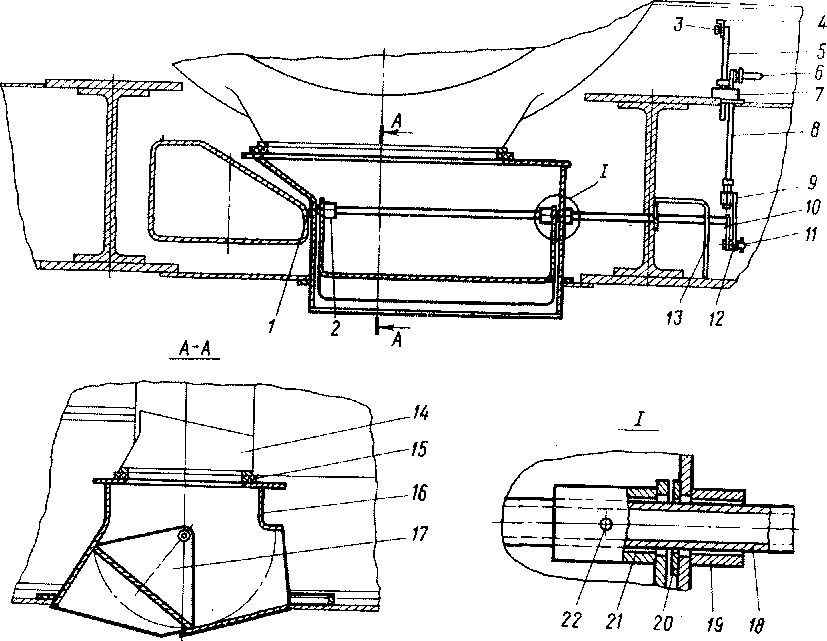Рис. 74. Дроссель на выхлопе тягового генератора: /, 2, 19, 21 — втулки; 3 — болт; 4 — уголок; 5 — планка; б — ручка; 7 — обечайка; * — тяга; 9 — кронштейн; 10 — рычаг; //, 18 — оси; 12, 20 — шайбы; 13 — стойка; 14 — выпускной патрубок тягового генератора; 15 — уплотнение; 16 — патрубок; 17 — заслонка; 22 — шплинт