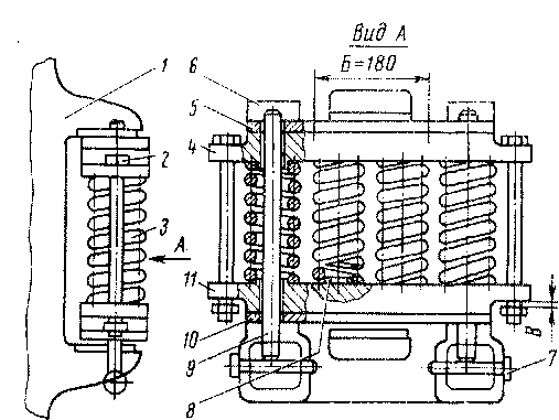 Рис. 89. Подвешивание тягового электродвигателя: 1 — тяговый электродвигатель; 2 — стяжной болт; 3 — пружина; 4, 11 — верхняя и нижняя балочки; 5, 10 — накладки; 6 — кронштейн рамы тележки; 7 — валик; <У — трубчатый выступ; 9 — направляющий стержень; Б — длина рабочей поверхности накладки; В — зазор