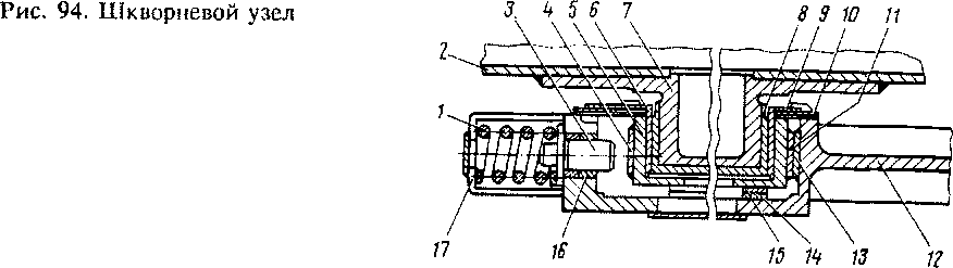 При поперечном перемещении шкворня ползун упирается в упор 3, который передвигается во втулке 16, запрессованной в гнездо, и своим буртом сжимает пружину /, помещенную в боковой цилиндрический стакан 17, закрепленный снаружи гнезда шкворневой балки. На противоположной стороне гнезда шкворневой балки установлено аналогичное упорно-возвращающее шкворневое устройство. Каждый стакан закреплен четырьмя болтами М24, Которые попарно законтрены проволокой. Пружины 1 установлены без создания предварительного усилия на упор (с зазором 0,5 мм). Жесткость пружин составляет 40-Ю5 Н/м (400 кгс/мм).