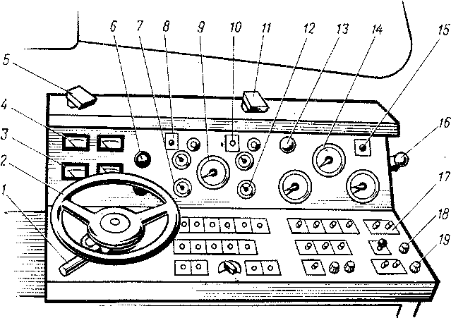 Рис. 102. Расположение аппаратов на пульте управления: / — реверсивная рукоятка; 2 — контроллер машиниста; 3 — амперметр зарядки батареи и указатель повреждений; 4 — вольтметр и амперметр тягового генератора; 5, // — лампы проверки бдительности; 6 — электроманометры масла [ и II секций; 7 — электротермометры масла и воды I секции; « — тумблер топливного насоса и пуска дизеля I секции; 9 — указатель скорости; 10 — тумблер топливного насоса и пуска дизеля II секции; 12 — электротермометры масла и воды II секции; 13 — кнопка аварийной остановки дизеля; 14 — манометры тормозной системы; 15 — лампа пропуска сигнала бдительности; 16 — кнопка проверки бдительности; 17 — тумблеры (слева направо): управления тепловозом, движения, холостого хода I и II секции, контроля сигнальных ламп, управления переходом, буферных фонарей и прожектора; 18 — тумблеры и кнопки (слева направо): управления холодильником, мотор-вентнляторов (4 тумблера), освещения кабины, зеленого света, освещения пульта, регулятор подсветки пульта, кнопка переключения лампы красно-желтого огня; 19 — тумблеры и кнопки (слева направо): указателя повреждений, определения неисправной секции, переключатель тормозной силы, тумблеры ЭДТ, ограничения боксования, автоматической подачи песка, кнопки подачи песка под 1-ю ось; вызова машиниста, тумблеры фильтра АЛСН, яркости сигналов проверки бдительности кнопка проверки