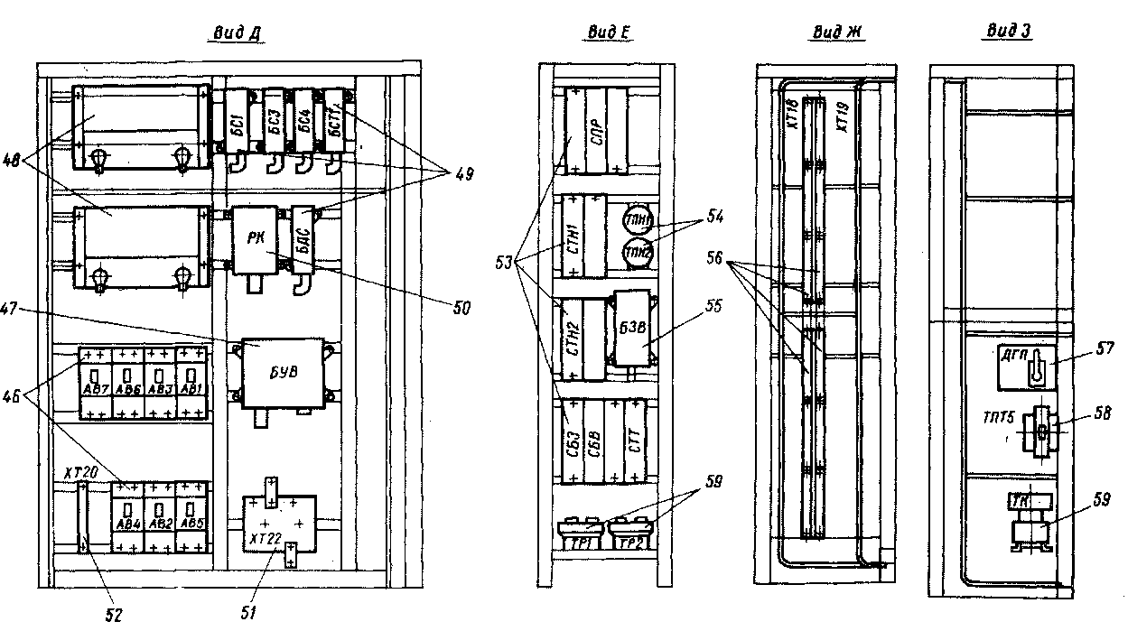 14, 29 — разъемы; 15 — реверсивный переключатель; 16 — тормозной переключатель; 17, 42, 52, 56 — колодки зажимов; 19 — амперметр тока возбуждения; 20 — кнопка проверки изоляции; 21 — вольтметр с кнопками; 23 — панель тумблеров ОМІ—ОМб, ТНА, ТОП, ТОД, ТОВ, ОМН, ТА, ТП2, ТПИ, ТПР, ТЭН, ТТРК; 27 — добавочный резистор; 28 — розетка; 32, 36, 38, 40, 45 — реле; 33 — блок боксования; 34 — блок резисторов; 33. зо — реле времени; 43, 49 — блоки выпрямителей; 44 — отключатели реле заземления; 46 — автоматический выключатель; 47 — блок управления возбуждением; 48 — панели реле; 50 — регулятор напряжения; 51 — панель зажимов; 54 — трансформаторы постоянного напряжения; 55 _тахометрическпй блок; 57 — д:юд; 5.? — трансформаторы постоянного тока; 59 — трансформатор коррекции