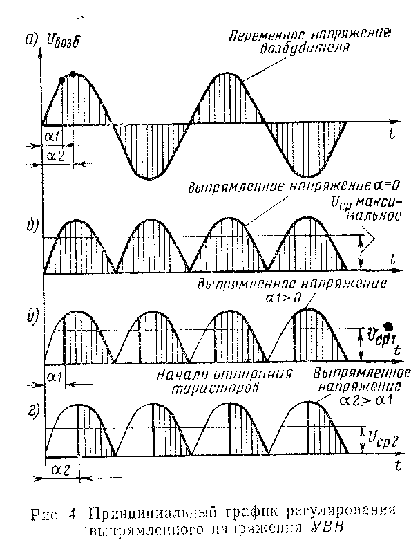 Промежуток времени от момента подачи положительной полуволны переменного напряжения с возбудителя на анод тиристора +Т до момента подачи отпирающего ■импульса на его управляющий электрод называется углом регулирования а (углом зажига-'ния). Чем больше угол регулирования а (см. рис. 4), тем меньше среднее выходное напряжение и ток выпрямителя