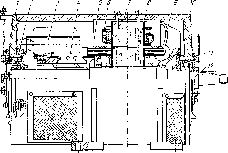 Рис. 114. Электродвигатель 2П2К: /, 10 — подшипниковые ихиты; 2, ii — подшипники; 3 — траверса; 4 — коллектор; 5 — бандаж; б — катушка полюса; 7 — магнитная система; * — якорь; 9 — вентилятор; 12 — вал