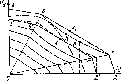 Участок АБ характеристики соответствует процессу ограничения напряжения. При дальнейшем увеличении напряжения на выходе выпрямителя увеличивается сигнал обратной связи по напряжению. Сигнал рассогласования, поступающий в управляющую обмотку блока БУВ вызывает увеличение угла регулирования тиристоров выпрямителя УВВ, в результате чего ток возбуждения и напряжение генератора уменьшаются. Дальнейшее возрастание напряжения вследствие уменьшения тока тяговых двигателей и увеличения противо-э. д. с. будет проходить менее интенсивно и приведет к еще большему увеличению угла регулирования.