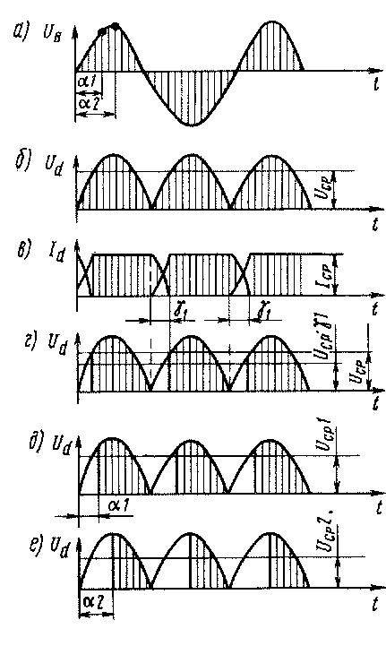 Как и в обычной мостовой схеме с диодами, запирание тиристора происходит в момент перехода синусоидального напряжения с полуволны одной полярности на другую (в момент перехода через нуль). Промежуток времени от момента поступления полуволны переменного напряжения с возбудителя на анод тиристора до момента подачи отпирающего импульса на его управляющий электрод называется углом регулирования а (углом зажигания). Как видно на рис. 152, г, д, е, с увеличением угла регулирования уменьшаются общее время прохождения тока через тиристоры и среднее значение выпрямленного напряжения £/ср. Его можно считать пропорциональным заштрихованной площади, ограниченной кривой выпрямленного напряжения. Изменяя угол регулирования от минимального до 180°, можно изменять среднее значение выпрямленного напряжения 1/ср и ток от наибольших до близких к нулю.