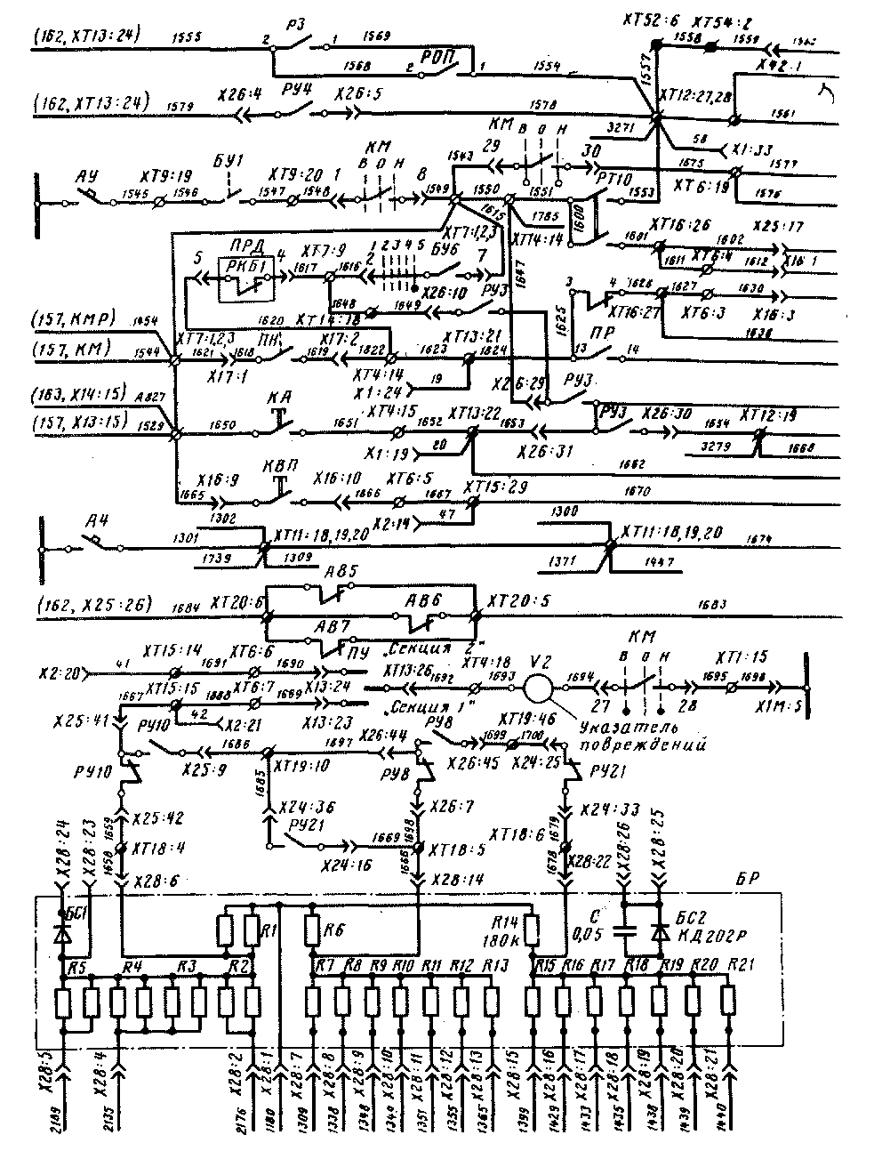 Измеритель \'2 указателя повреждений при установке переключателя ПУ в положение "Секция 2" через провода 1690, 1691, отвод 41, контакт 20 розетки Х2, межсекционное соединение, контакт 21 розетки Х2 второй секции, отвод 42 соединяется с измерительной схемой указателя второй секции.. Это позволяет контролировать вышеупомянутые цепи во второй секции. Практически .указатель позволяет уточнить участок, на котором необходимо вести поиск неисправности традиционными методами.