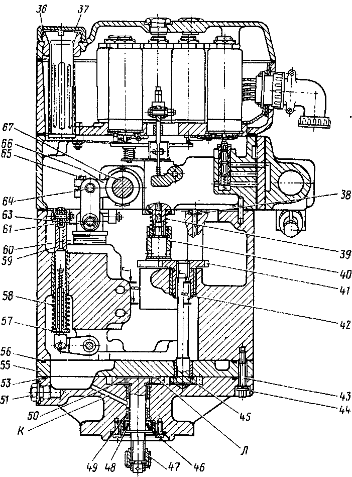 Рис. 37. Объединенный регу-/ — поршень аккумулятора; 2 — клапан масляного насоса; 3 — букса; 4 — поводок; 5 — золот-рычаги; 9 — корыто; 63 — оси; 12, 24 — кронштейны; 13, 53, 56 — уплотнительные кольца; 19 — шток; 20, 26, 31, 33 — планки; 22, 27, 34, 59 — тяги; 23 — винт; 25, 28 — траверсы; 29 — горловина; 37, 46 — крышки; і<¥ — уплотнительная шайба; 40, 41 — шестерни; 42 — стопорное втулка; 48 — манжета; 49 — втулка; 51 — пробка отверстия для слива масла; 52 — измеритель поршень управления частотой вращения; 64 — палец; 67 — силовой вал; Д — установочный слива масла из аккумулятора; К — канал для