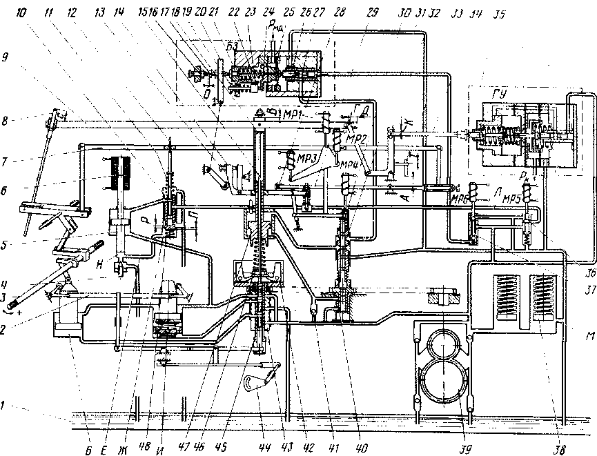 Рис. 38. Схема объединенного регулятора: 1 — масляная панна регулятора; 2 — рычажная передача; 3 -— вал; 4 — игла; 5 — поршень серводвигателя индуктивного датчика; 6 — индуктивный датчик; 7 — рычажная передача к золотнику регулирования нагрузки; <¥ — шток; 9 — суммирующий рычаг; 10 — втулка регулирования нагрузки; 11 — золотник регулирования нагрузки; 12 — толкатель; 13, 17 — регулировочные болты; 14 — кулачок; 15 — золотник регулятора скорости; 16 — болт регулирования стопа; 18 — траверса; 19 — пробка; 20, 29, 32 — рычаги; 21 — стакан; 22 — пружина обратной связи блока зашиты; 23 — микропереключатель; 24 — тарелка; 25 — мембранный блок; 26 — золотниковая втулка; 27 — золотник блока зашиты; 28 — ролик; 30 — золотник управления частотой вращения; 31 — втулка управления частотой вращения; 33 — регулировочный винт; 34 — тяга; 35 — винт регулирования наклона тепловозной характеристики; 36 — золотник; 37 — золотник выключения; 38 — аккумулятор масла; 39 — масляный насос; 40 — механизм изменения длительности набора частоты «ращения; 41 — клапан; 42 — измеритель скорости; 43 — букса; 44 — сектор согласования положения поршней; 45 — подвижная втулка; 46 — всережимная пружина; 47 — поршень управления частотой вращения; 48 — пружина; Л — зазор между винтом и рычагом регулятора мощности; Б — полость под поршнем силового серводвигателя; В — зазор на выключение; Д — размер от края суммирующего рычага до точки Г; Е — канал изо-дромной обратной связи; Ж — изодромная полость золотника регулирования нагрузки; И г-полость под поршнем дополнительного серводвигателя; К — размер, определяющий наклон ограничительной характеристики по давлению наддува; Л — канал для подвода масла к золотнику; М — канал для слива масла из аккумулятора; Н — изодромная полость серводвигателя; О — зазор механизма выключения регулятора по падению давления масла; П, Р — перекрыши; С — величина выстунання штока; Т — величина выступления регулировочного винта