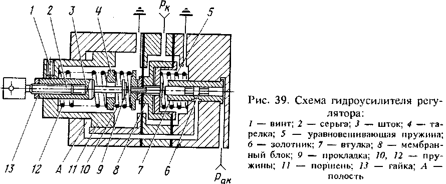 В установившемся режиме поршень // гидроусилителя находится в равновесии под действием пружин обратной связи 10 и 12 и давления масла в управляющей полости А. Мемранный блок 8 и золотник 6 также находятся в среднем положении под действием пружин обратной связи 10 и 12, уравновешивающей пружины 5, давления масла Рак на золотник 6 и усилия от давления наддувочного воздуха Рк в мембранном блоке 8. При увеличении давления наддувочного воздуха Рк мембранный блок 8 и золотник 6 смещаются вправо, что вызывает снижение давления в полости А и перемещение поршня 11 со штоком 3 влево. Новый установившийся режим наступит, когда прирост силы давления наддувочного воздуха будет полностью компенсирован уменьшением силы от пружин обратной связи. При уменьшении давления наддувочного воздуха элементы гидроусилителя перемещаются в противоположном направлении и при Рк = 0 поршень 11 занимает крайнее правое положение.