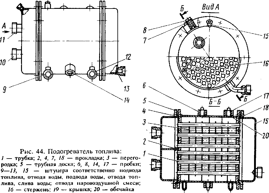Подогреватель топлива (рис. 44) состоит из трубной части, сварной обечайки и крышек. Трубная часть изготовлена из 88 трубок 7, приваренных к трубным доскам 5. Для улучшения теплопередачи от воды к топливу на каждую трубку надеты и припаяны к ней 70 тонких пластин с турбулизаторами. Крышки прикреплены болтами к трубным доскам 5 и уплотнены паронитовыми прокладками 4 и 18. Топливо подводится к штуцеру 9, проходит по каналу, образованному обечайкой и перегородками 3, и отводится через штуцер 12. Перегородки удерживаются от осевого смещения дистанционными трубками, надетыми на два стержня 16. Крышка со стороны подвода и отвода воды имеет перегородку. Между перегородкой и трубной доской 5 установлена резиновая прокладка 2, толщина которой в свободном состоянии на 4—6 мм больше зазора между перегородкой и доской. Через штуцер 13 сливают воду из корпуса подогревателя при сливе воды из системы охлаждения. Паровоздушная смесь отводится через штуцер 15. Из полости топлива воздух выпускают выворачиванием пробки 8. Отвернув пробку 14, можно взять топливо на анализ, чтобы убедиться в отсутствии попадания воды в топливную систему. Через отверстие, закрытое этой пробкой, можно слить отстой; оно может быть использовано и при промывке топливной полости. С 1987 г. на тепловозах устанавливают подогреватели топлива без промывочных отверстий, закрываемых пробками 6 и 17.