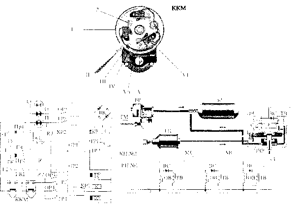 В I и II положениях ручки крана машиниста (см. рис. 5.2) через его контроллер (ККМ) отсутствуют цепи для возбуждения реле К, ОР и ТР. Контактами последних создается цепь для протекания переменного тока через диодный мост ВК и возбуждения реле КР. Его контактами включается лампа О светового сигнализатора (СС), показывающая, что цепи управления и контроля исправны. За счет высокой индуктивности электромагнитных вентилей ОВ и ТВ переменный ток через них практически не протекает, и оба вентиля обесточены.